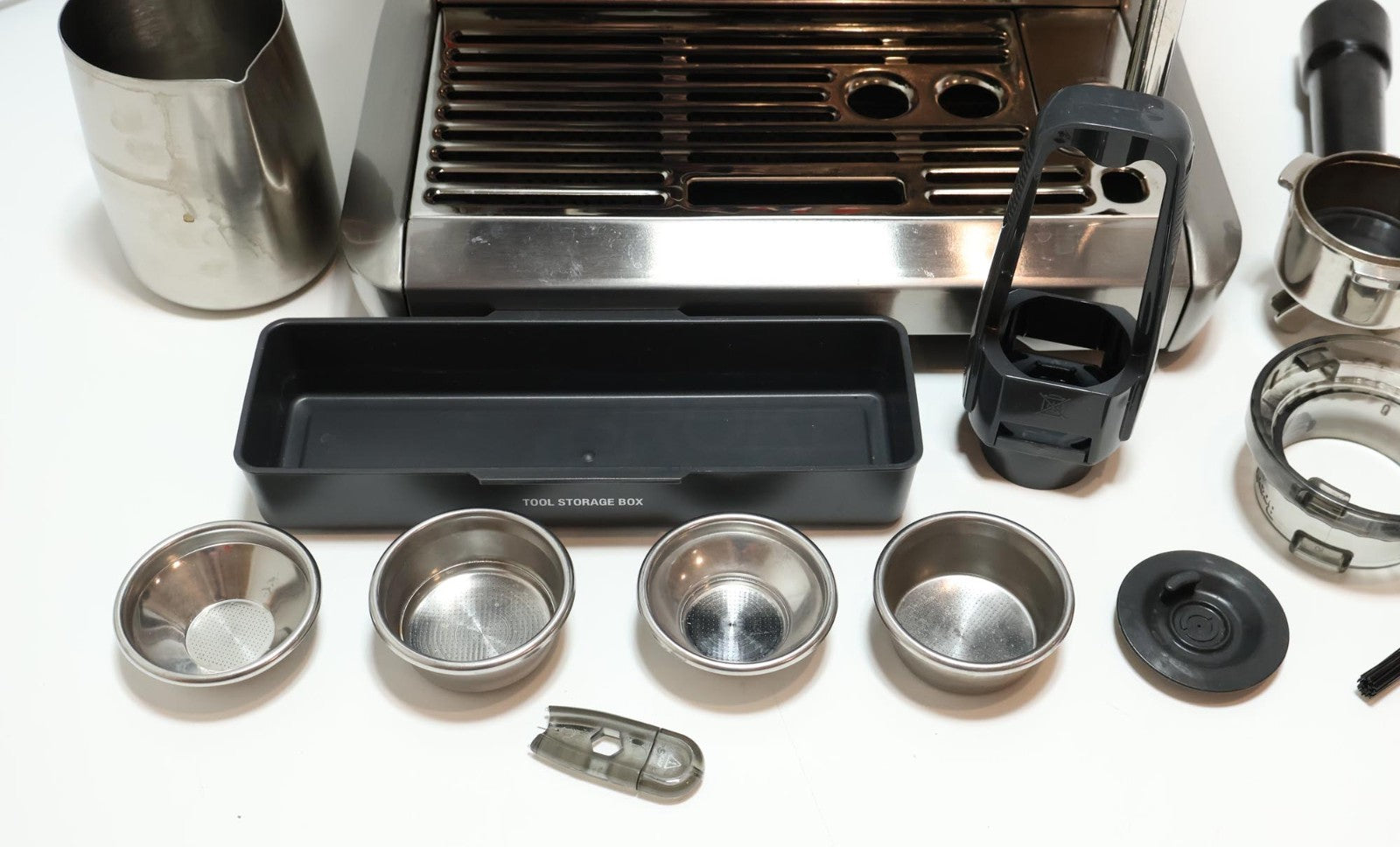 Includes: Espresso Machine, Bean Hopper, Bean Hopper Lid, Water Reservoir, Drip Tray, Stainless Steel Mug, Portafilter Spacer, Cleaning Brush, Portafilter, Silicone Portafilter Cover, Single-Wall Single Shot Portafilter Basket, Single-Wall Double Shot Portafilter Basket, Dual-Wall Single Shot Portafilter Basket, Dual-Wall Double Shot Portafilter Basket, Filter Housing