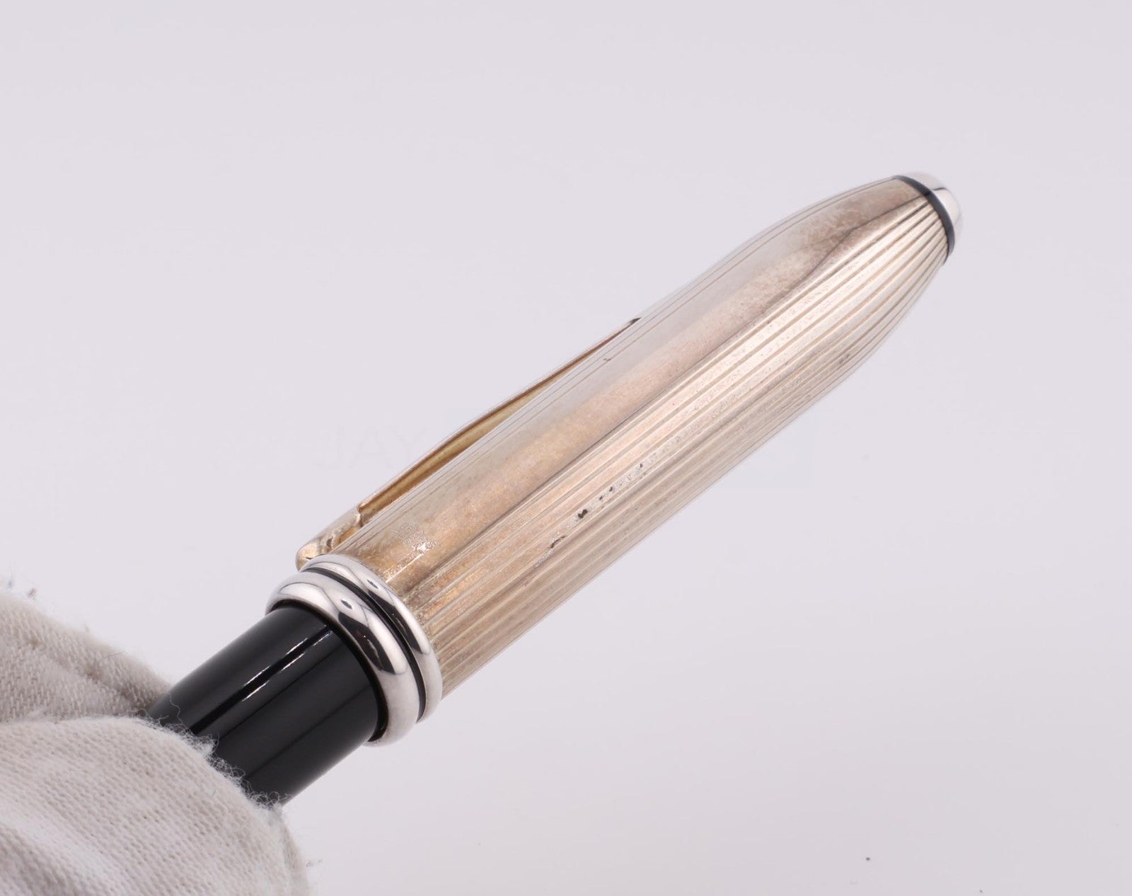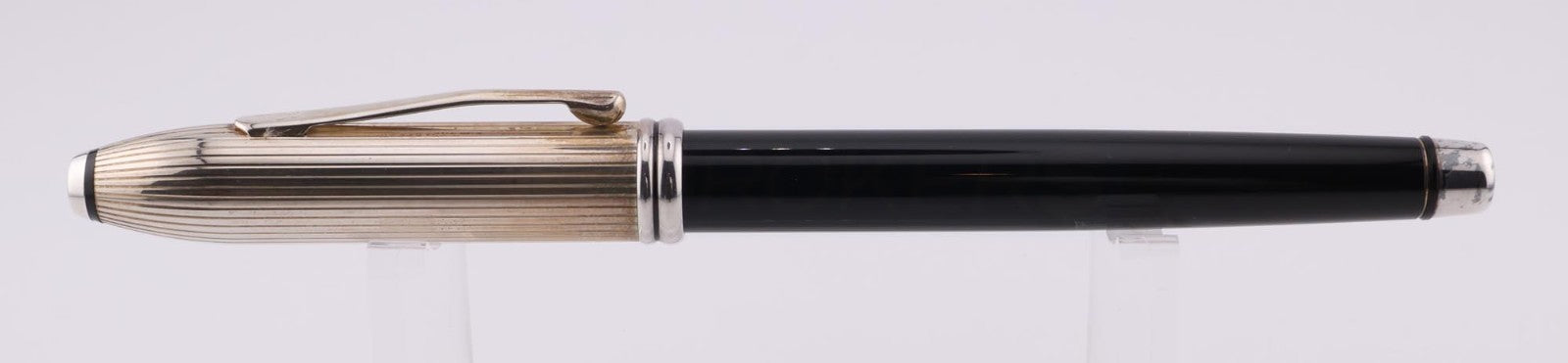 This pen is gently used. The pen shows minor to average signs of wear and tear including scuff marks and worn finishes. The metal finishes are discolored slightly. The ring below the nib has oxidation present. Please refer to the pictures to get a better idea of the physical condition. We tested the fountain pen by drawing in test water and expelling it. The display case may not be original to the item. It has a silver-colored finish on the cap, although there are no official sterling silver markings on it. Any adjustments, inking, cleaning, and/or maintenance are the expense and responsibility of the new owner. All pictures included in this listing are of the actual item for sale.