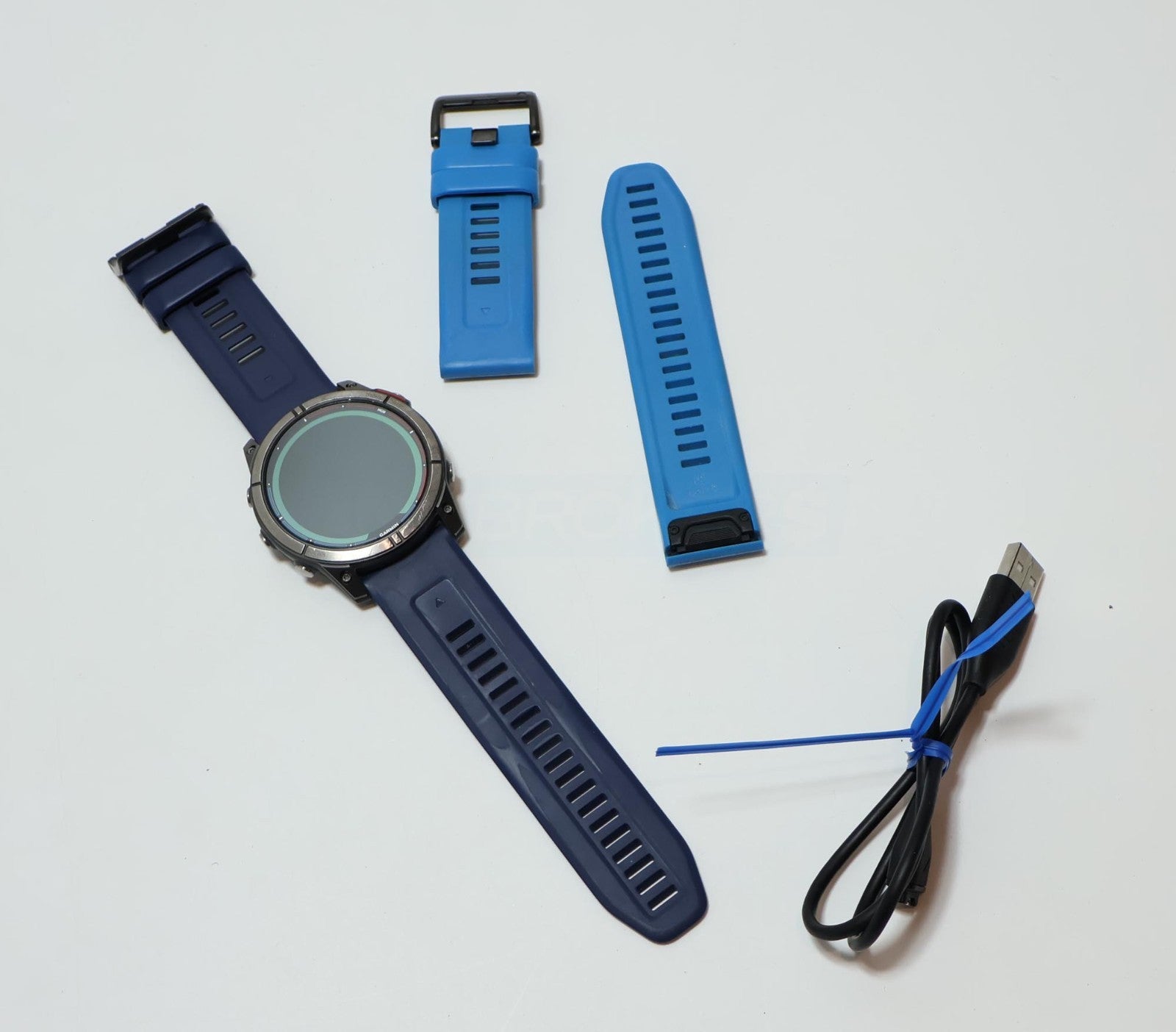 Includes: Watch, Light Blue Band, Medium Blue Band, Charging Cable