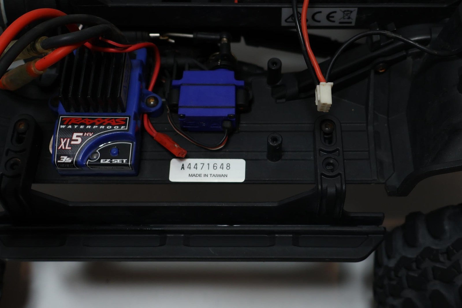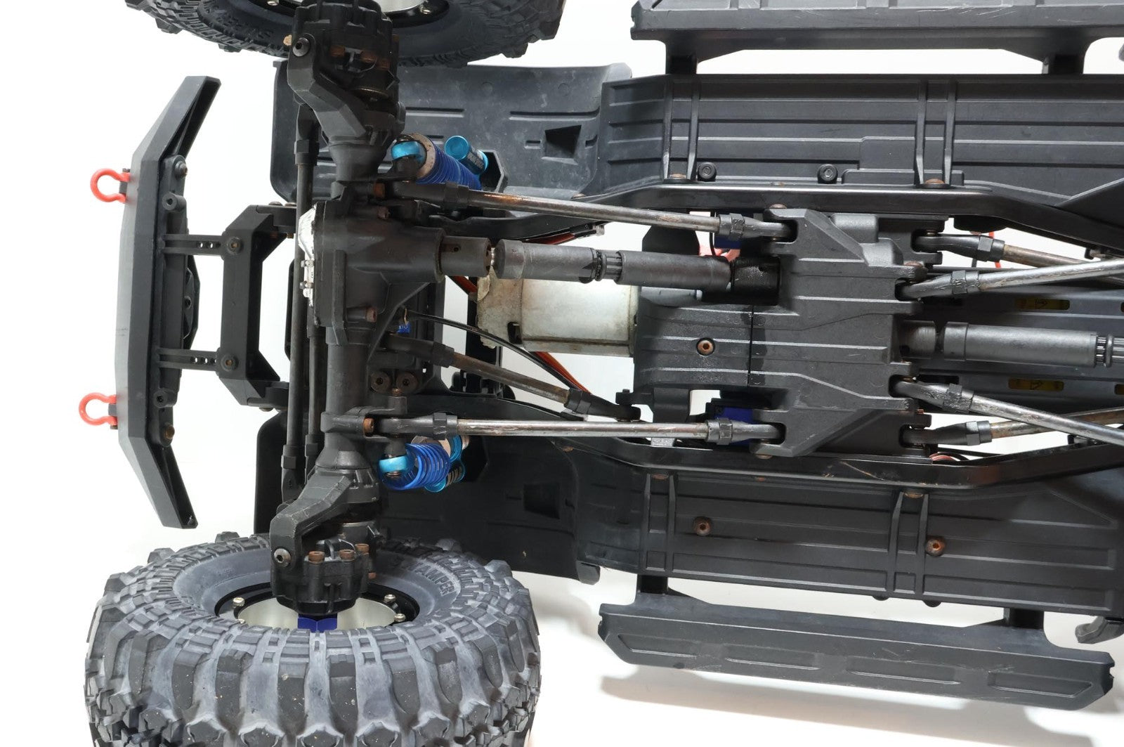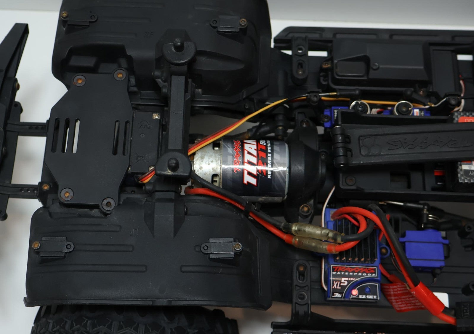 This item is used. The item shows average to moderate signs of wear and tear including scuff marks, scratches, nicks, and worn finishes. We noticed signs of oxidation on some of the screws and metal parts on the chassis. It appears the truck has custom tires and potentially other parts including suspension. The top of the body is heavily scratched with what appear to be small cracks. Some of the silver trim stickers are peeling off or ripped. Note the body pins are missing. Please refer to the pictures to get a better idea of the physical condition. We tested the unit with an in-house TQi controller and it worked as expected (see test video). Note the included battery is a 2S aftermarket version and a charger is NOT included. A controller will be required in order to operate it (NOT included). Any setup, configuration, modifications, and/or maintenance are the expense and responsibility of the new owner.