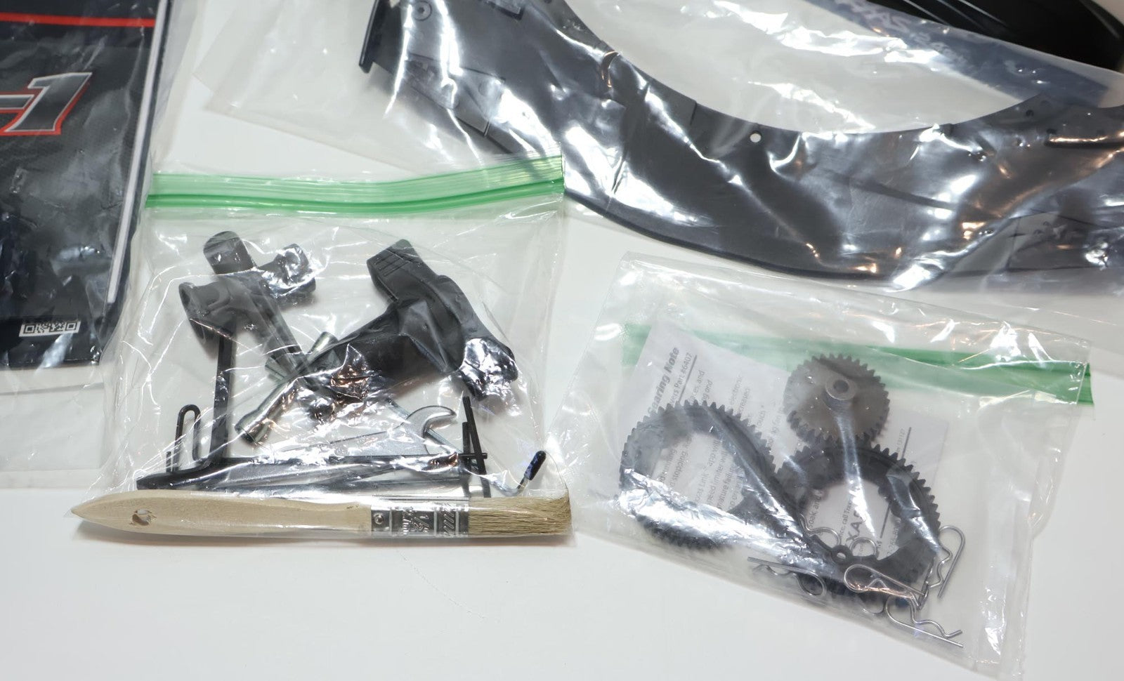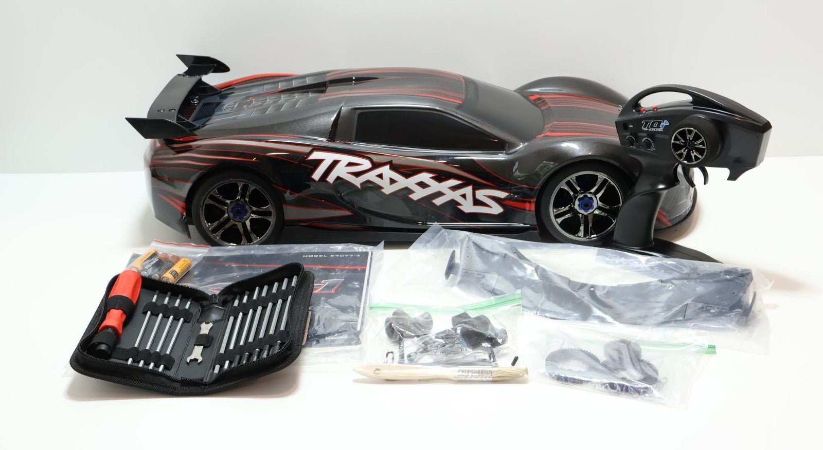 Includes: RC Car Body, RC Car Shell, Remote Control, Extra Gears, Extra Diffuser, Maintenance Kit, Misc Tools, Manual/Documentation, Original Box (RC Car Battery NOT Included)