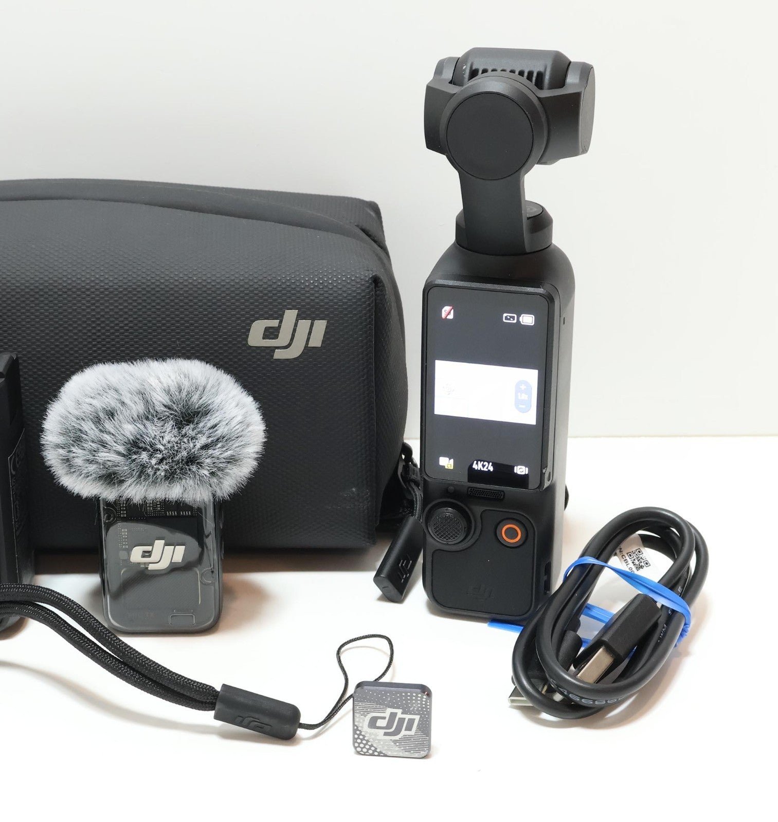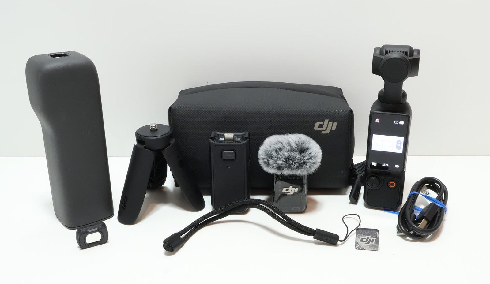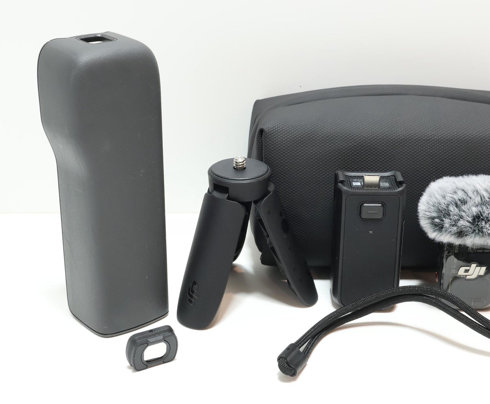 Includes: Camera, DJI Mic 2 Transmitter, Mini Tripod, Battery Handle, Wide Angle Lens, USB-C Cable, Mic Attaching Magnet, Wrist Strap, Hard Case, Carrying Case