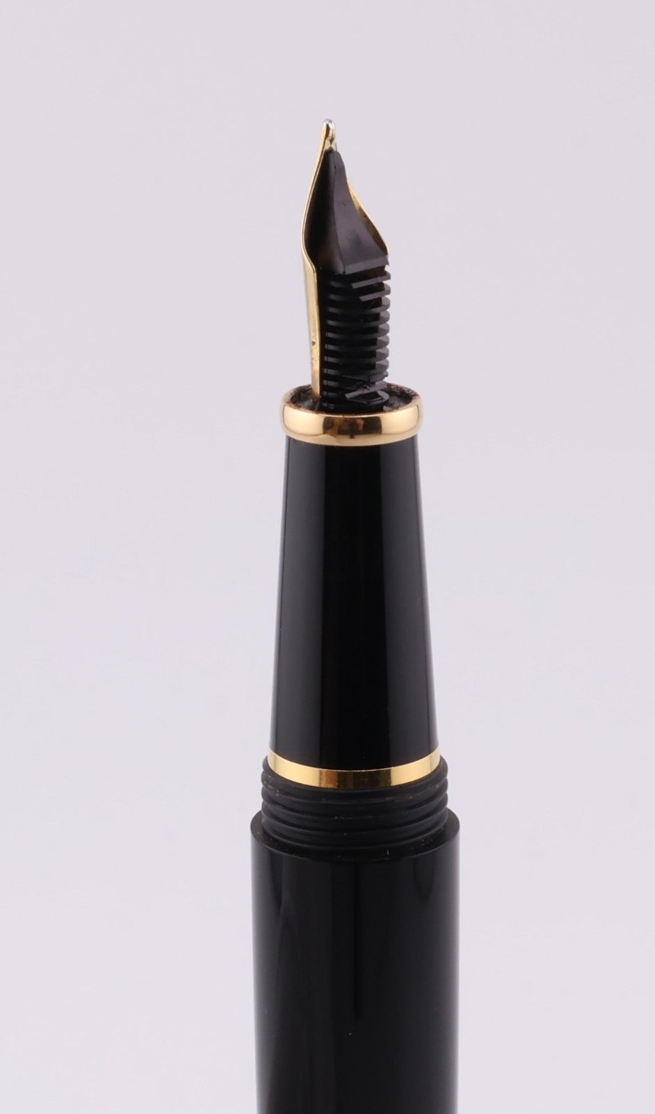 This pen is gently used. The pen shows minor to average signs of wear and tear including scuff marks and worn finishes. The cartridge has some ink stuck behind the piston. Please refer to the pictures to get a better idea of the physical condition. We tested the fountain pen by drawing in test water and expelling it. Any adjustments, inking, cleaning, and/or maintenance are the expense and responsibility of the new owner. All pictures included in this listing are of the actual item for sale.