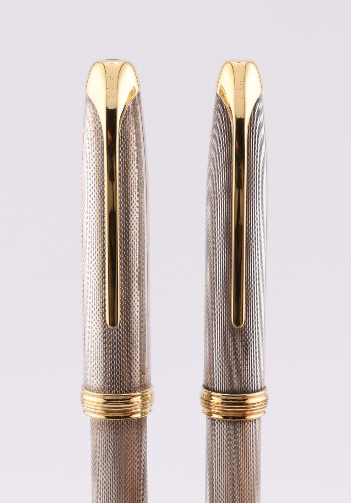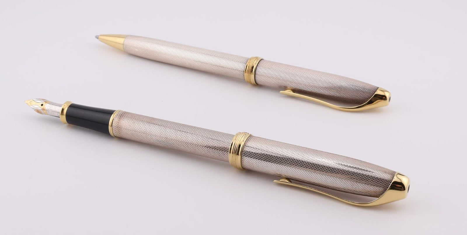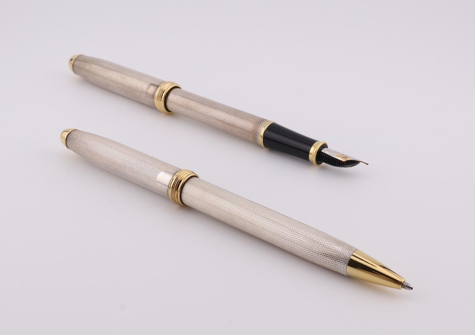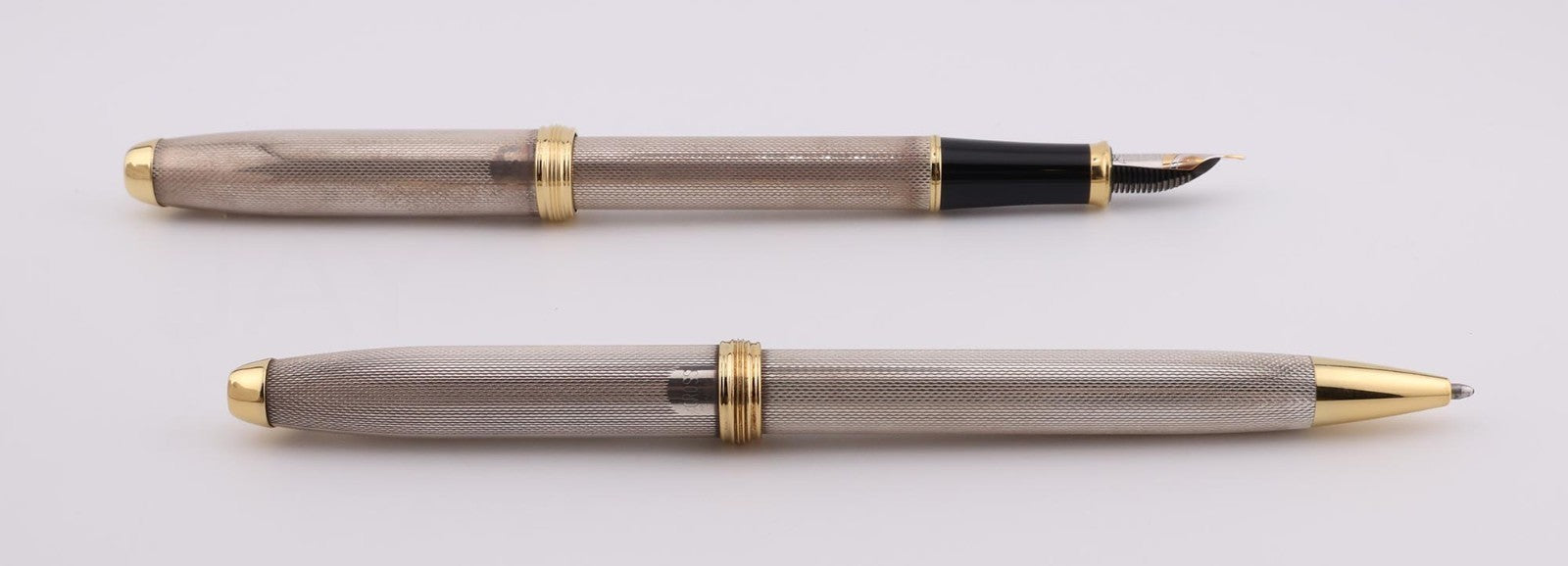 These pens are gently used. The pens shows minor signs of wear and tear including scuff marks and worn finishes. The silver is tarnished and discolored in places. Please refer to the pictures to get a better idea of the physical condition. The ballpoint pen works, but we're uncertain how much ink remains. We were unable to test the fountain pen. The display cases/boxes for both may not be original to the items. Any adjustments, inking, cleaning, and/or maintenance are the expense and responsibility of the new owner. All pictures included in this listing are of the actual item for sale.