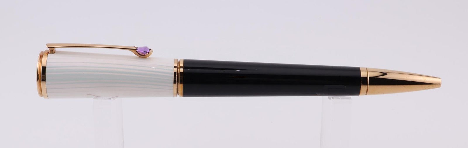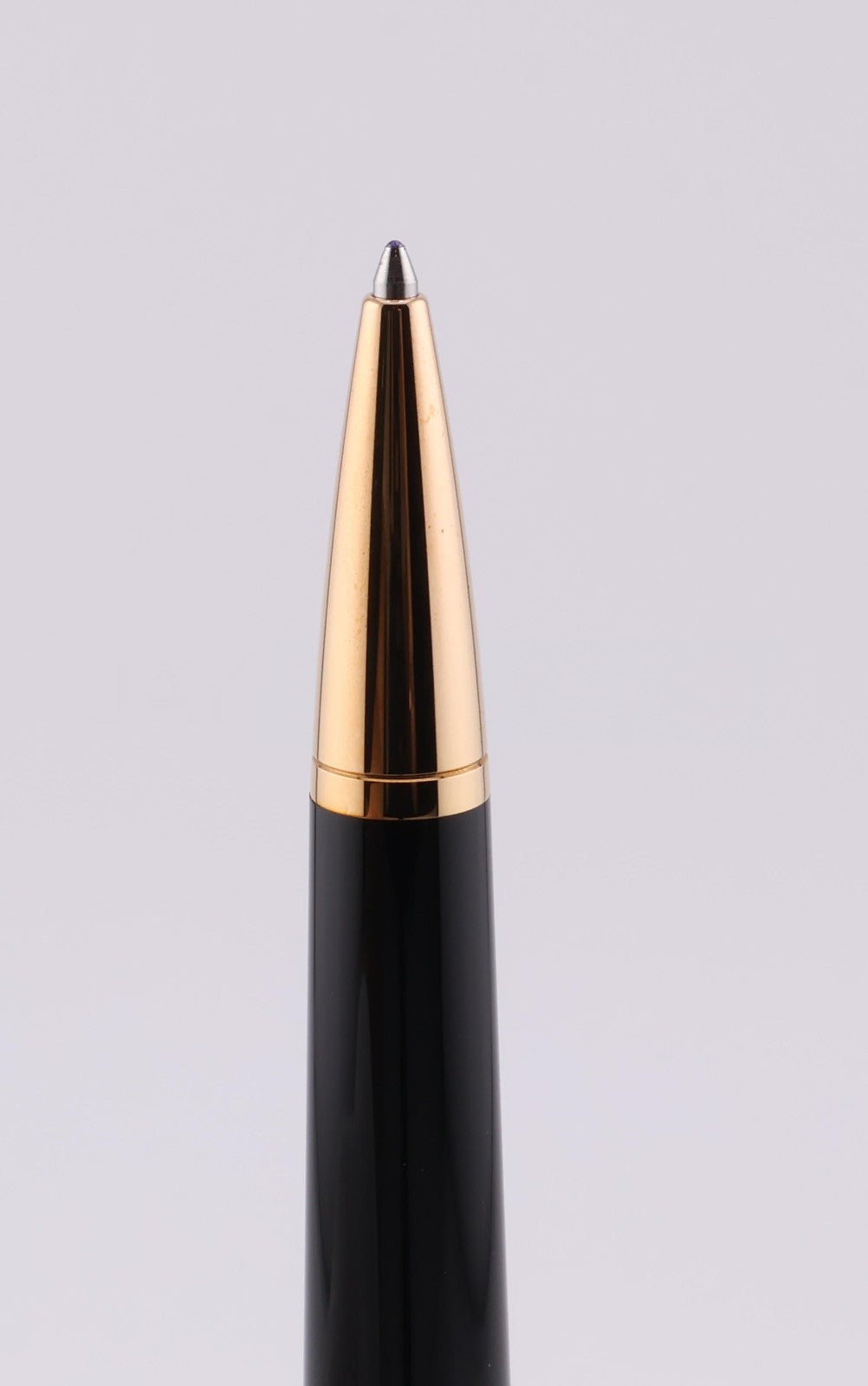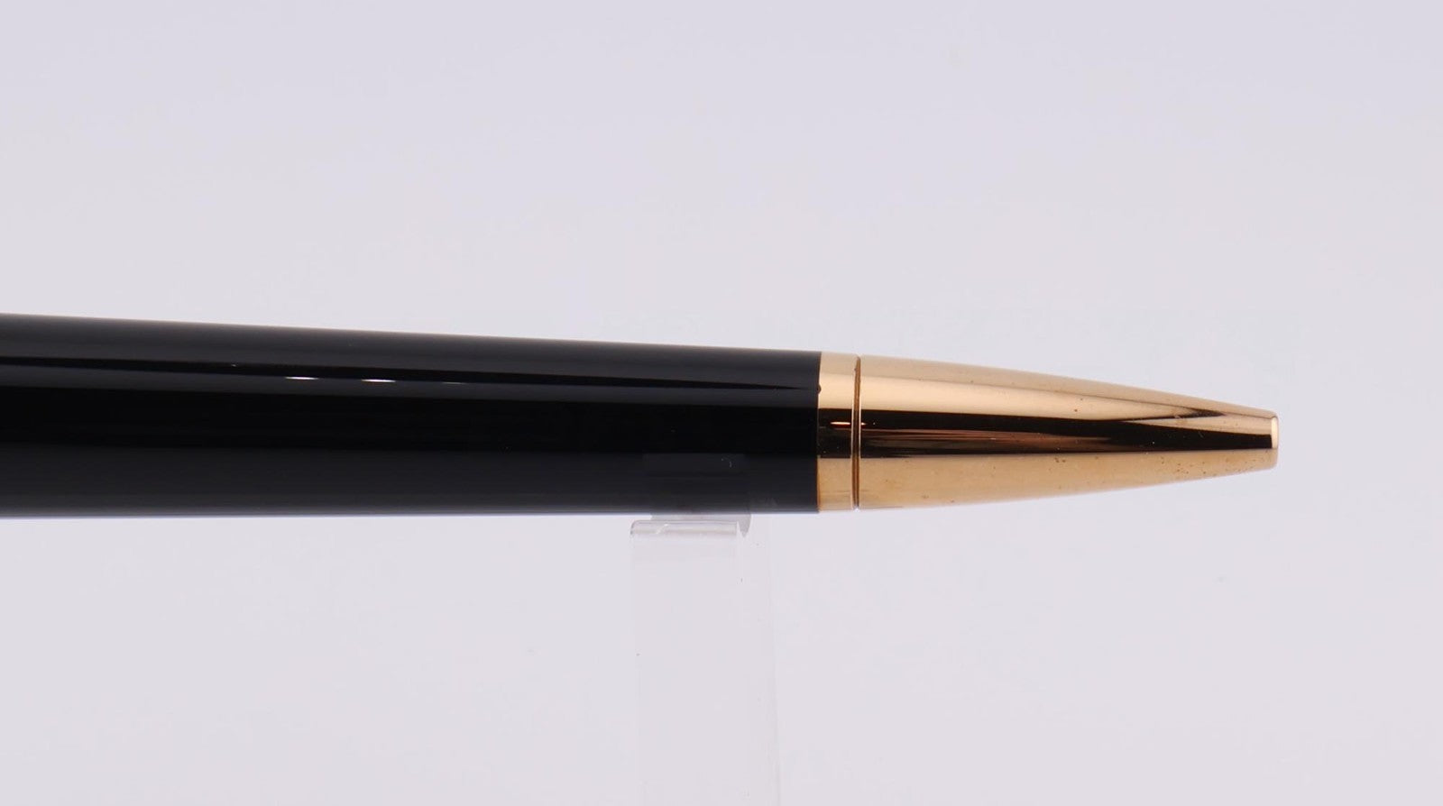 This pen is gently used. The pen shows minor signs of wear and tear including scuff marks and worn finishes. The material in the display case is disintegrating slightly, leaving white flakes when it is disturbed. Please refer to the pictures to get a better idea of the physical condition. The ballpoint pen works, but we're uncertain how much ink remains. Any adjustments, inking, cleaning, and/or maintenance are the expense and responsibility of the new owner. All pictures included in this listing are of the actual item for sale.
