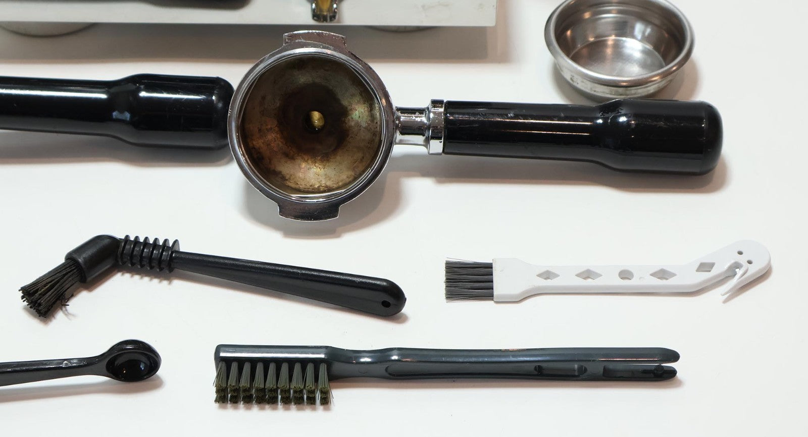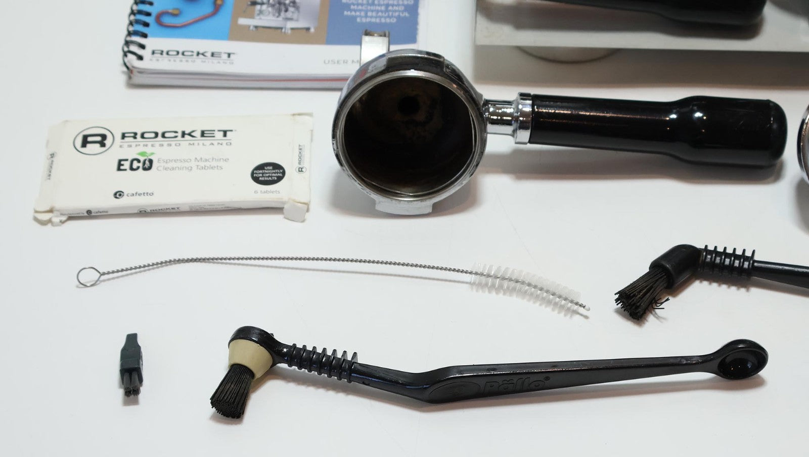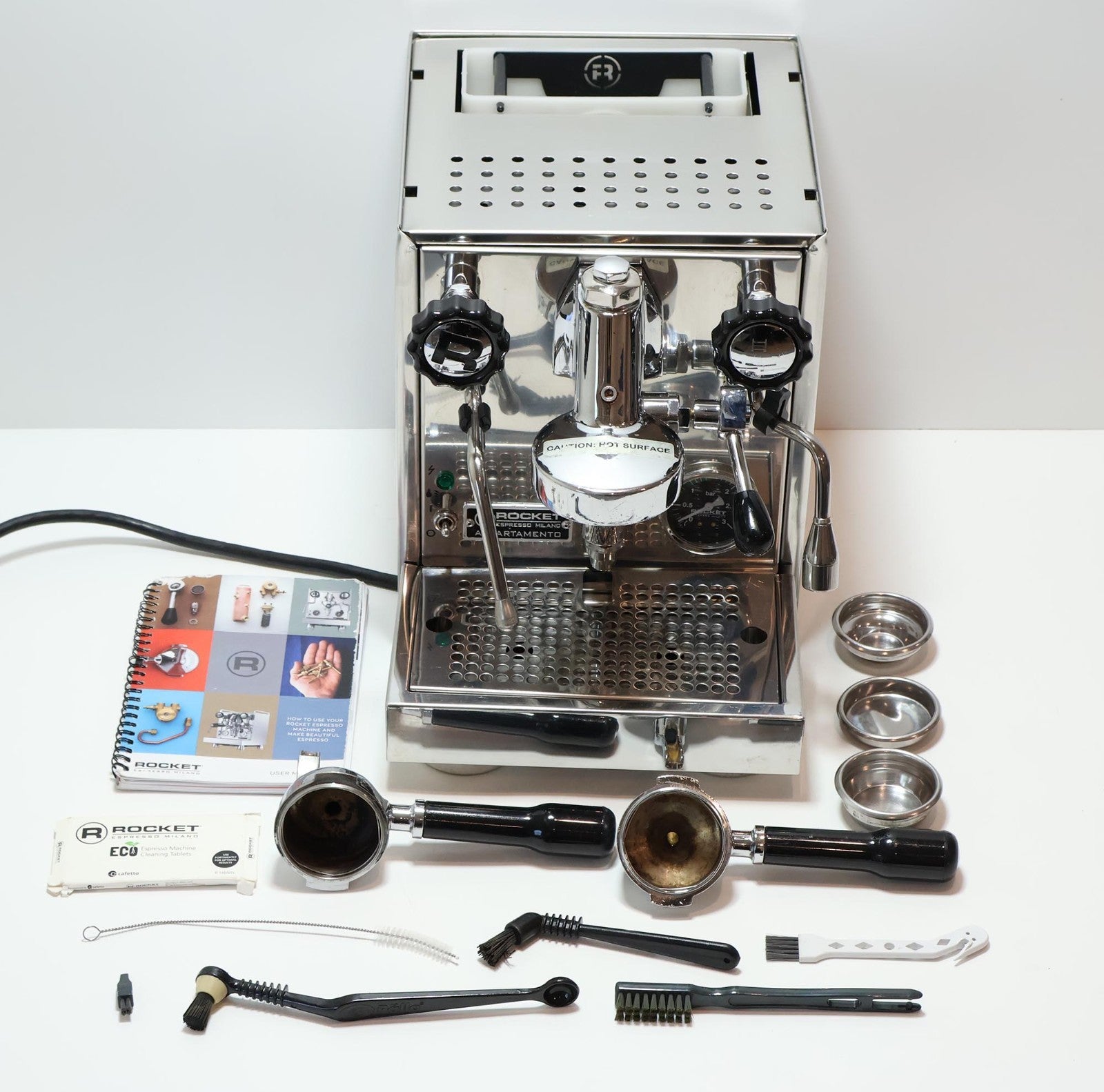 Includes: Espresso Machine, Drip Tray, Water Reservoir, Single Outlet Portafilter, Double Outlet Portafilter, Single Shot Basket, Double Shot Basket, Back Flush Cap, Measuring Spoon, 5x Cleaning Tools, Espresso Machine Cleaning Tablets, Owner Manual
