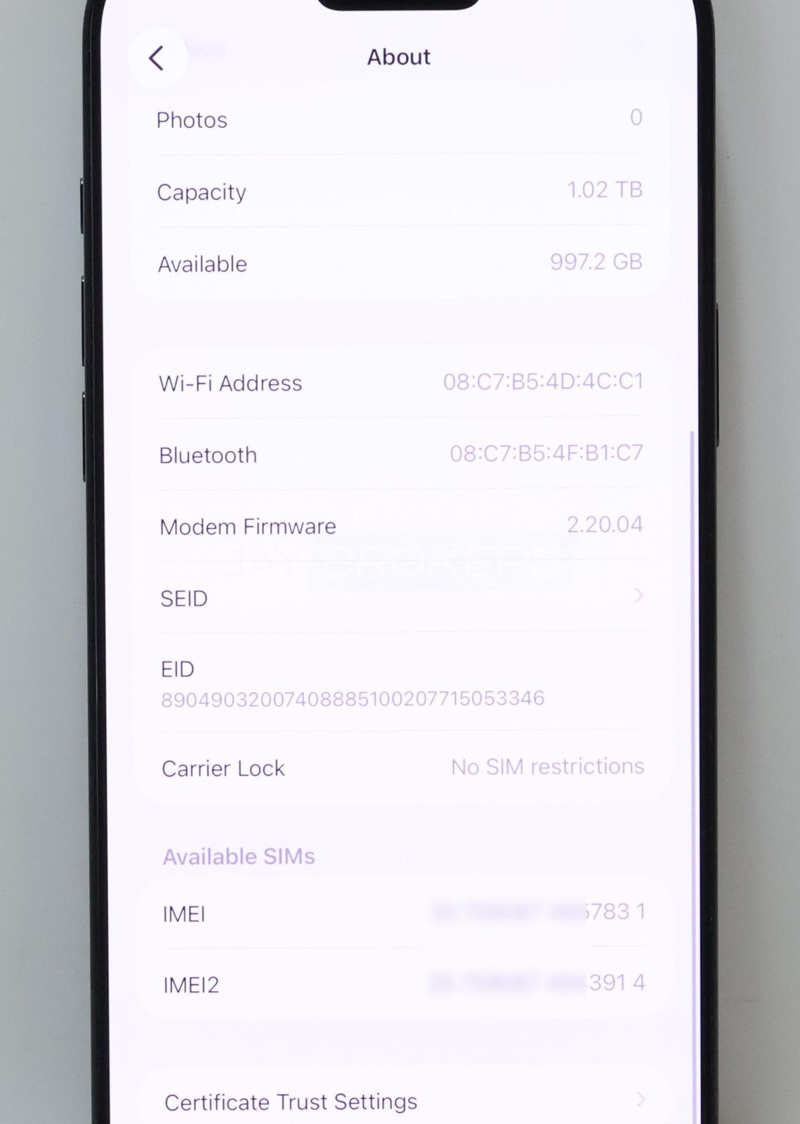 This item is used. The item shows average signs of wear and tear including scuff marks, scratches, nicks, and worn finishes. There are some deeper scratches on the screen. Please refer to the pictures to get a better idea of the physical condition. The screen has no dead pixels. The battery holds a solid charge (100% Maximum Capacity, 246 Cycle Count). The item has been tested and is fully functional. The new owner will need a compatible eSIM supplied by the carrier in order to use the cellular capability. The IMEI (***********7831) has been verified as of 12/03/2025 and is not reported lost or stolen.