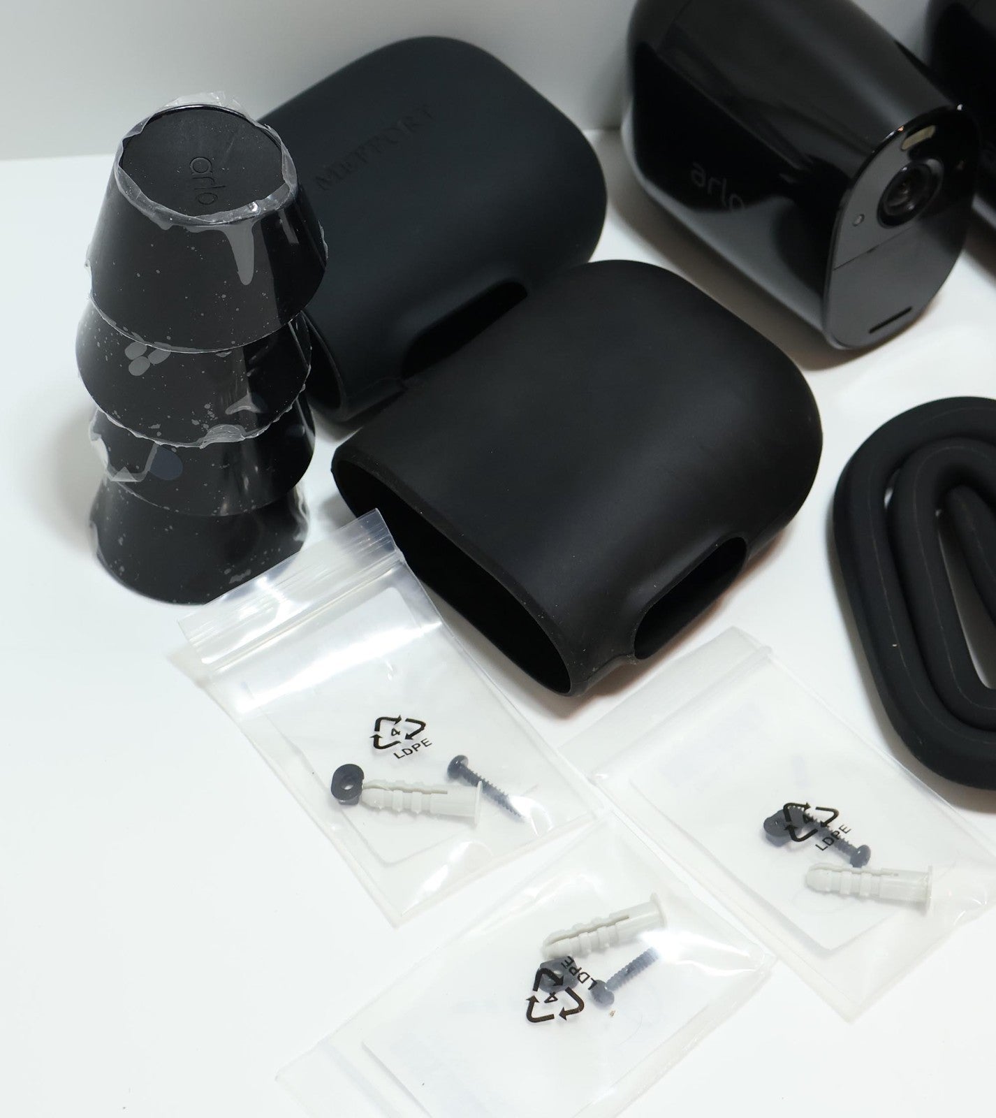 Includes: SmartHub, 4x Cameras, Ethernet Cord, 5x Protective Cover, 4x Wall Mounts, 3x Wall Mount Kits, 4x Flexible Twist Mount