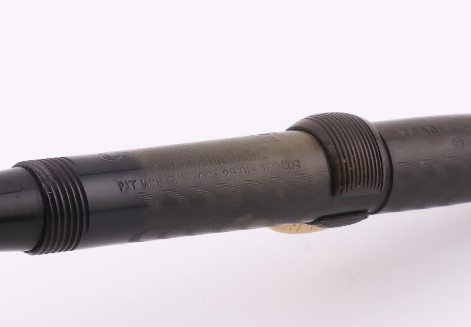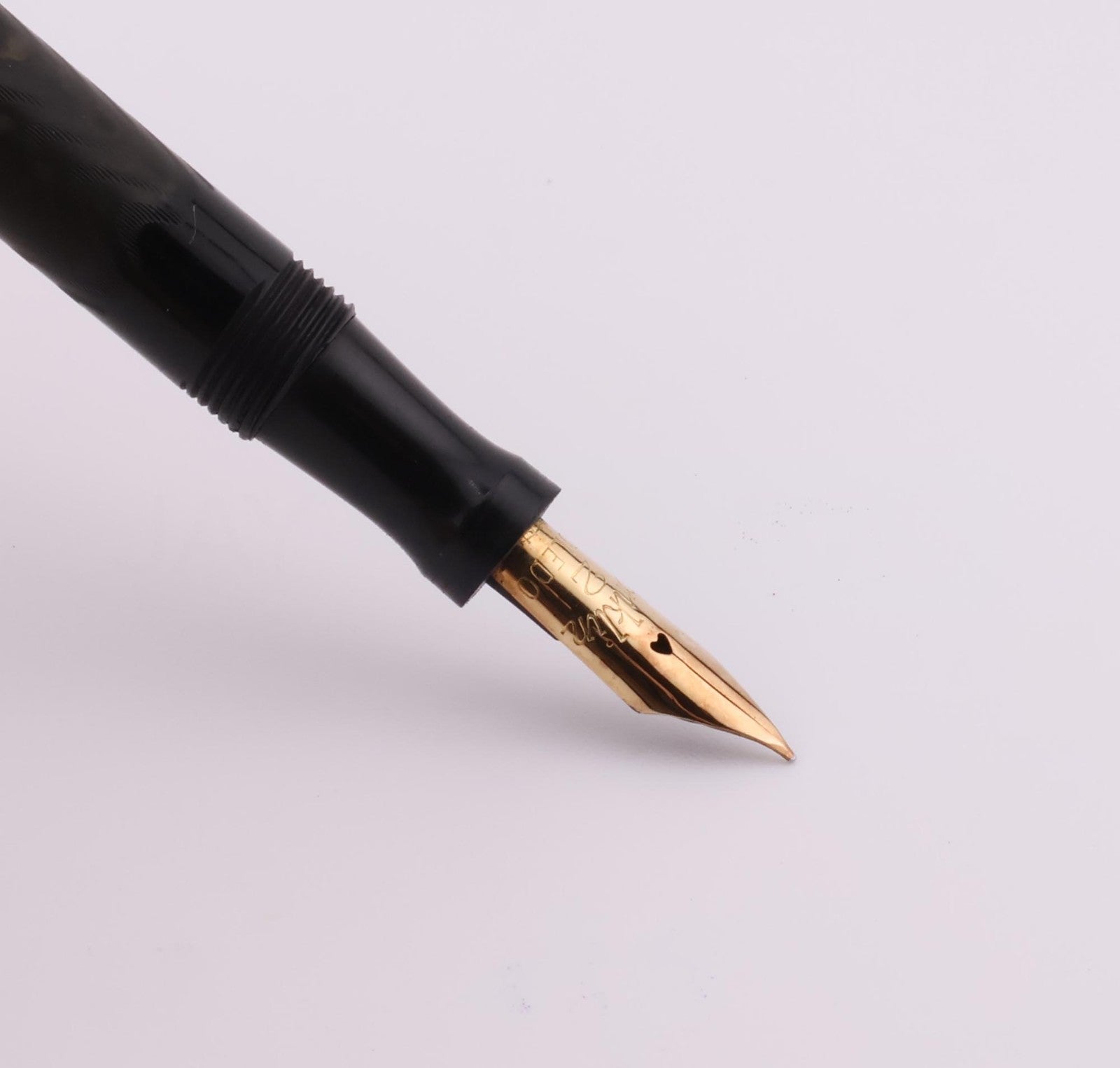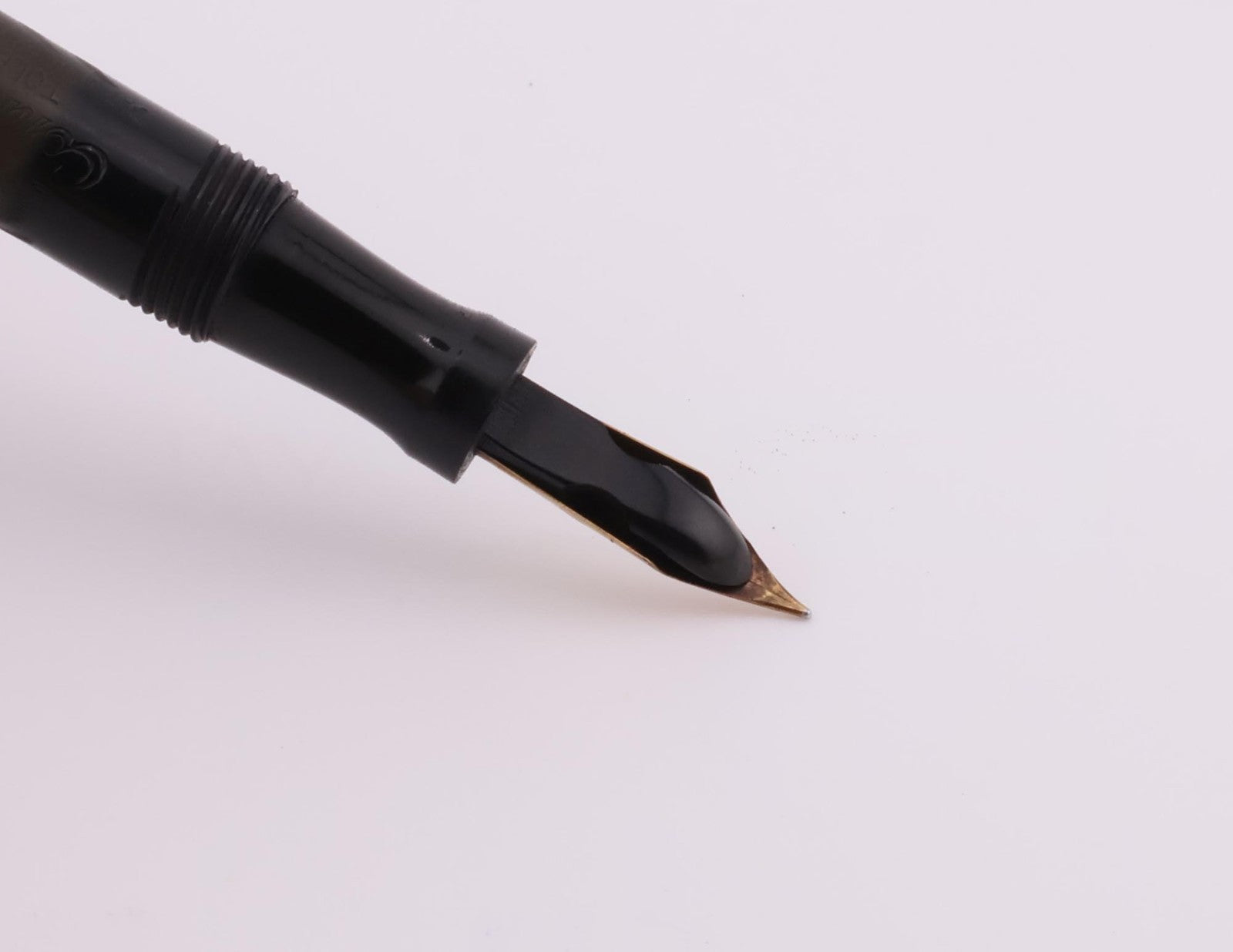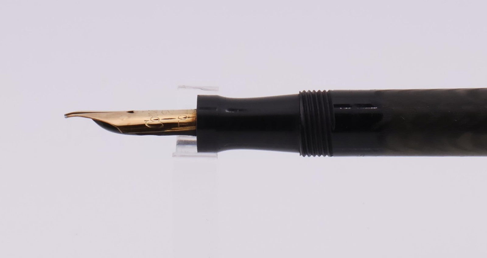 This pen is used. The pen shows average signs of wear and tear including scuff marks, scratches, nicks, and worn finishes. There is a crack on the cap. The gold finish on this item is discolored in several areas particularly on the nib. The mechanism used to lock the plunger in place can sometimes get stuck in place. Please refer to the pictures to get a better idea of the physical condition. Any adjustments, inking, cleaning, and/or maintenance are the expense and responsibility of the new owner. All pictures included in this listing are of the actual item for sale.