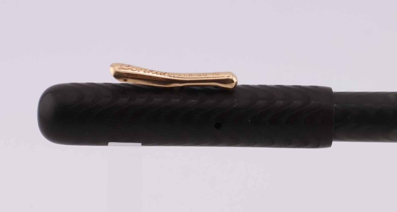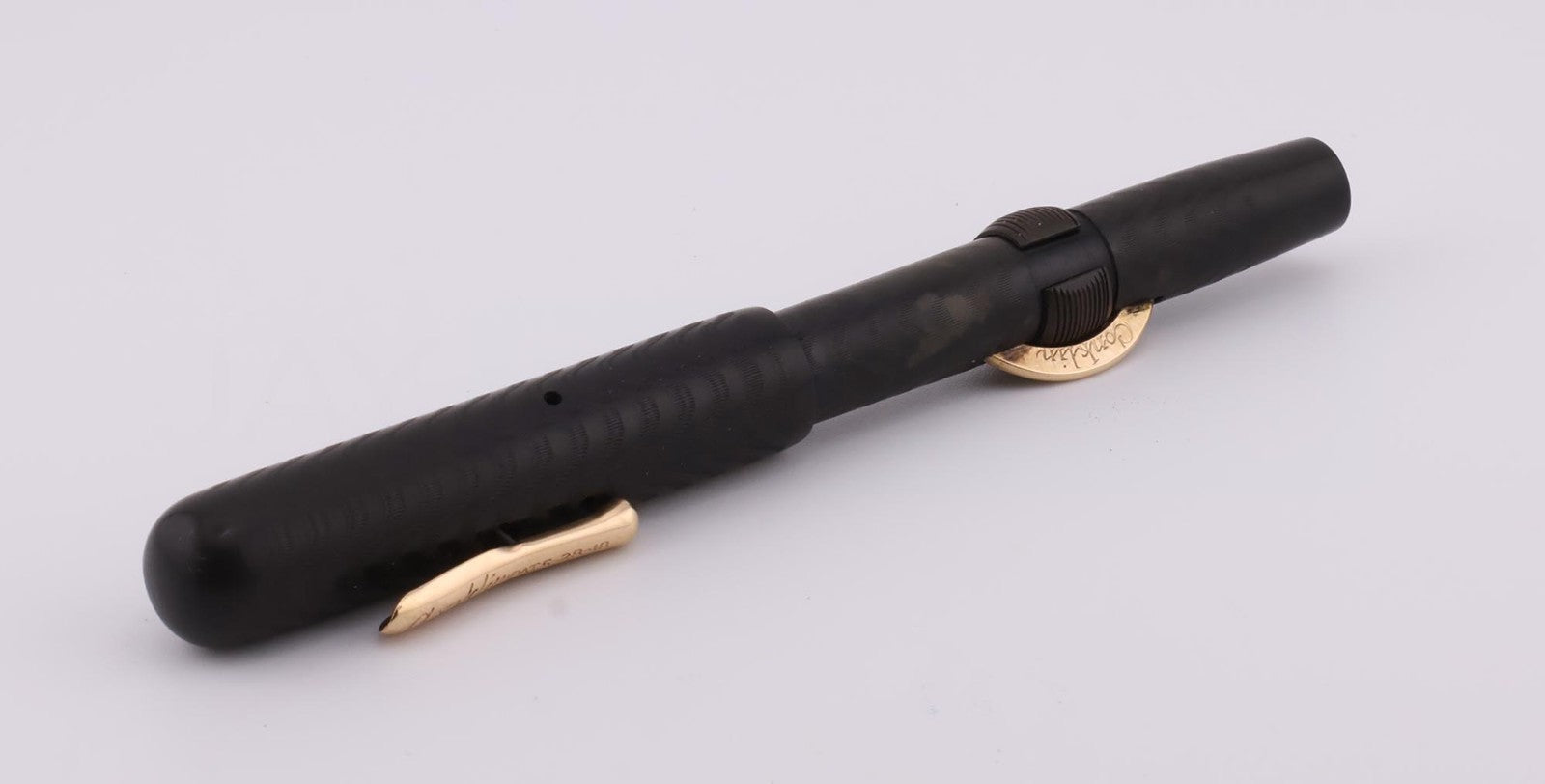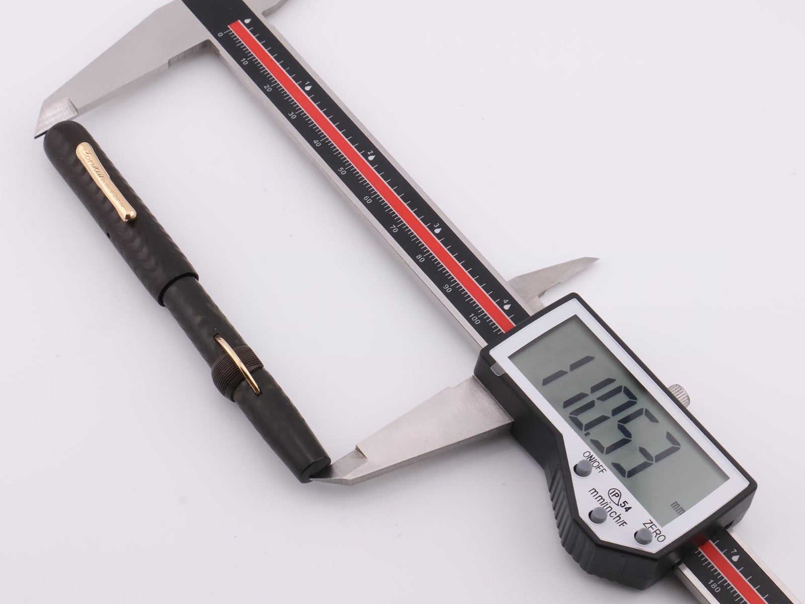 This pen is used. The pen shows average signs of wear and tear including scuff marks, scratches, nicks, and worn finishes. There is a crack on the cap. The gold finish on this item is discolored in several areas particularly on the nib. The mechanism used to lock the plunger in place can sometimes get stuck in place. Please refer to the pictures to get a better idea of the physical condition. Any adjustments, inking, cleaning, and/or maintenance are the expense and responsibility of the new owner. All pictures included in this listing are of the actual item for sale.