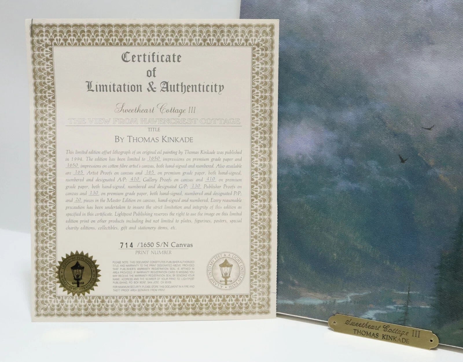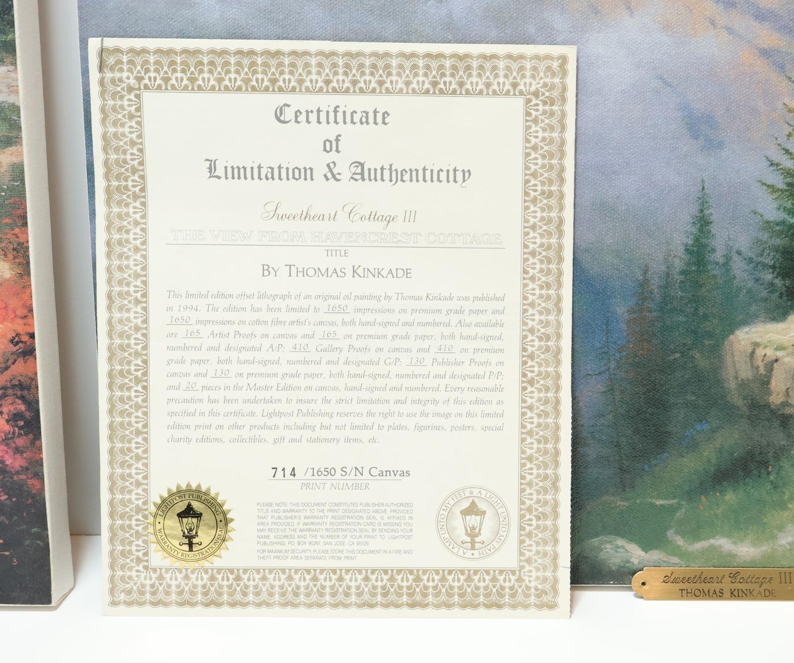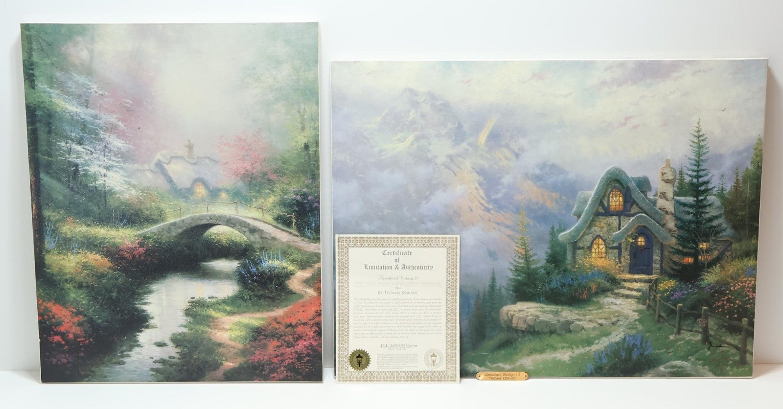 Includes: Thomas Kinkade Sweetheart Cottage III 24x18 S/N Canvas (Highlighted) w/ Certificate of Authenticity & Gold Name Plaque, Thomas Kinkade Brookside Hideaway S/N 16x20 Canvas (Highlighted) w/ Gold Name Plate (CoA NOT Included)