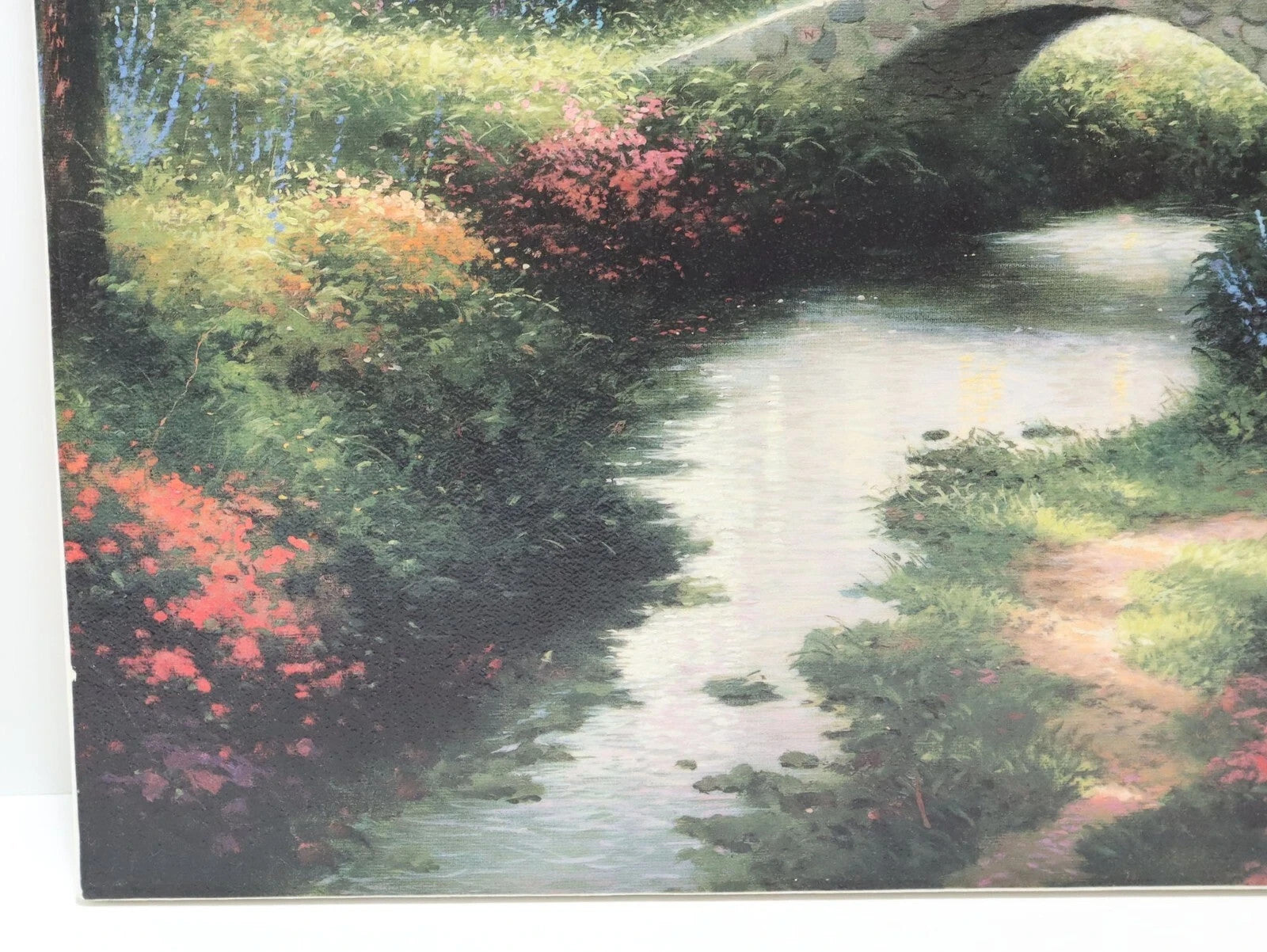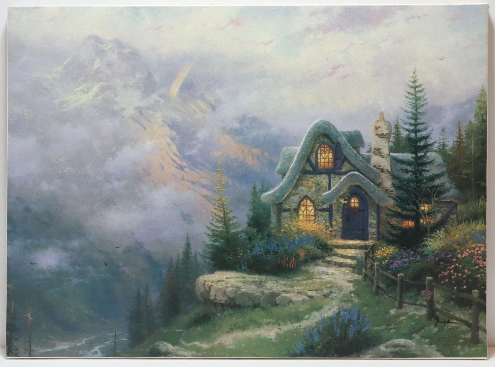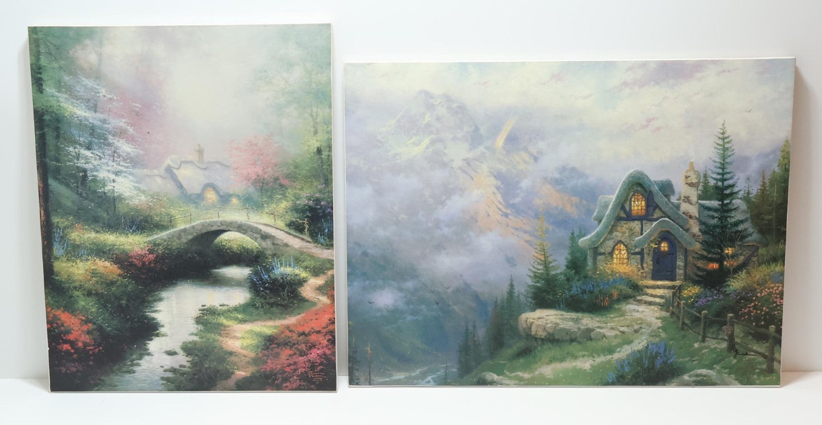 The canvases are gently used, showing minor signs of wear and tear including scuff marks, scratches, and worn finishes. The edges have some previous wear and impressions from a frame (not included). Please refer to the pictures to get a better idea of the physical condition. On Sweetheart Cottage, you can clearly see the signature on the lower right corner, while on Brookside Hideaway it is visible but extremely faint. Both have numbers on the canvas, but they are extremely faint (sometimes the ink they used fades over time). There is highlighting on the prints, mainly on the flowers. All pictures included in this listing are of the actual items for sale.