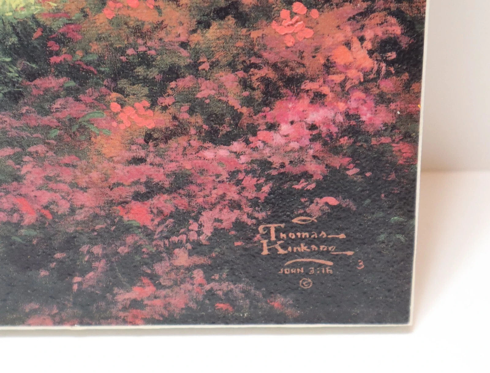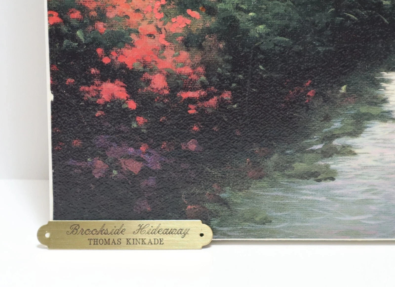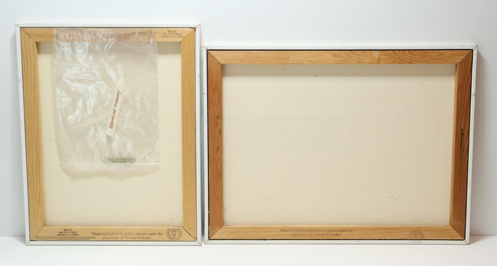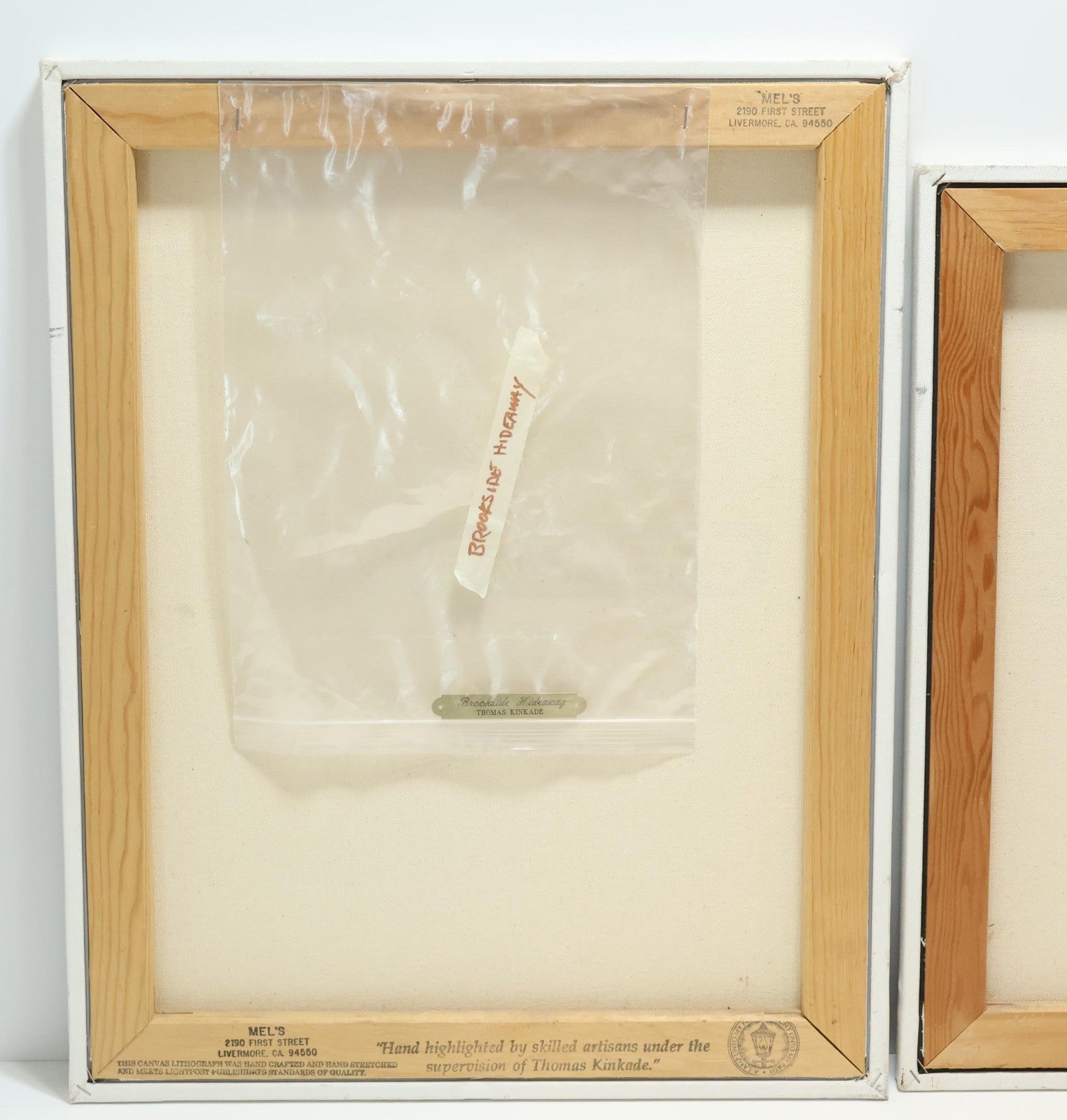 The canvases are gently used, showing minor signs of wear and tear including scuff marks, scratches, and worn finishes. The edges have some previous wear and impressions from a frame (not included). Please refer to the pictures to get a better idea of the physical condition. On Sweetheart Cottage, you can clearly see the signature on the lower right corner, while on Brookside Hideaway it is visible but extremely faint. Both have numbers on the canvas, but they are extremely faint (sometimes the ink they used fades over time). There is highlighting on the prints, mainly on the flowers. All pictures included in this listing are of the actual items for sale.