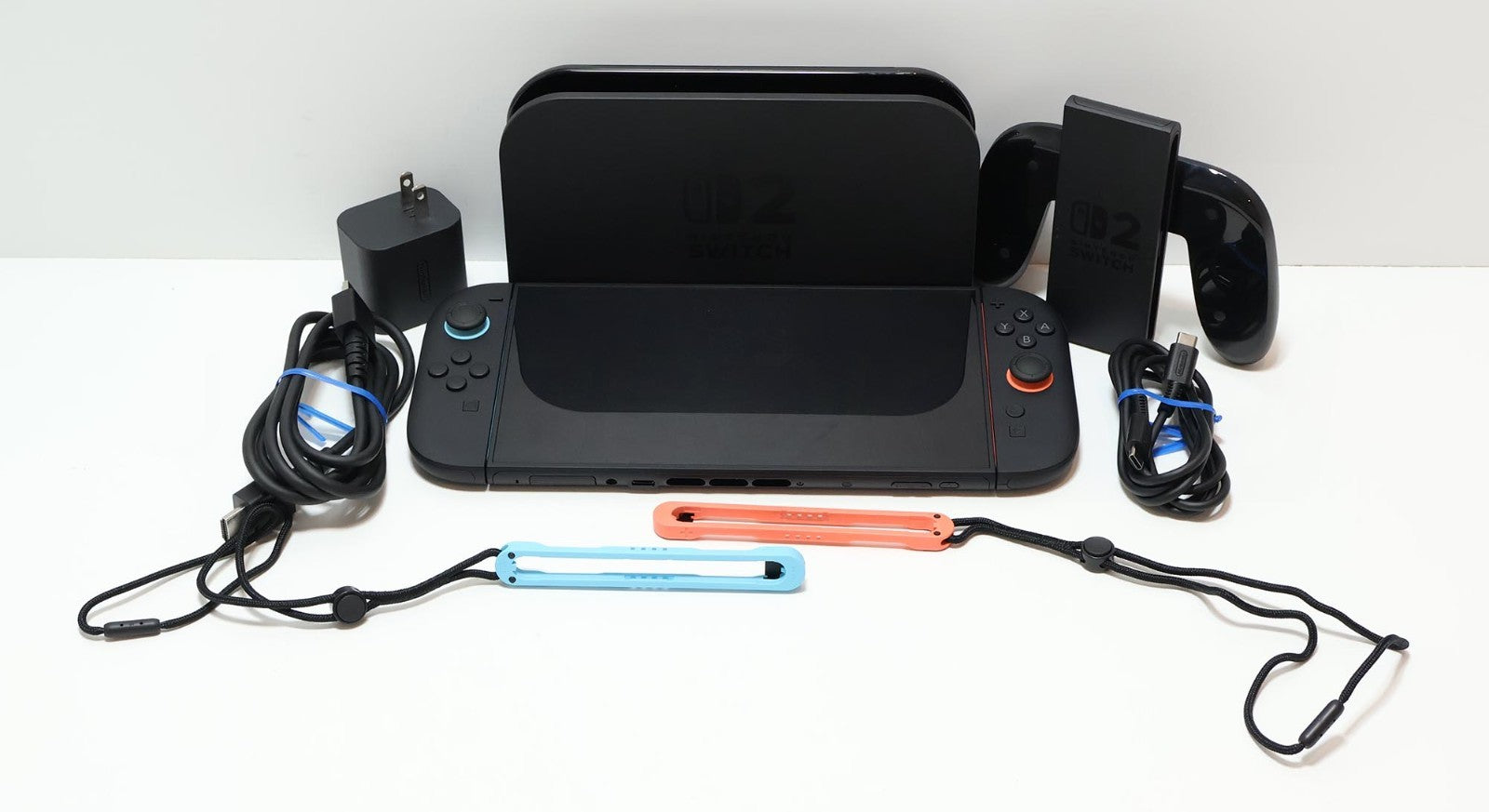 Includes: Switch, 2x Joycons (L & R), USB-C Cable, AC Adapter, Switch 2 Dock, Joy Con Grip, 2x Joy Con Straps, HDMI Cable, Manual/Documentation, Original Box