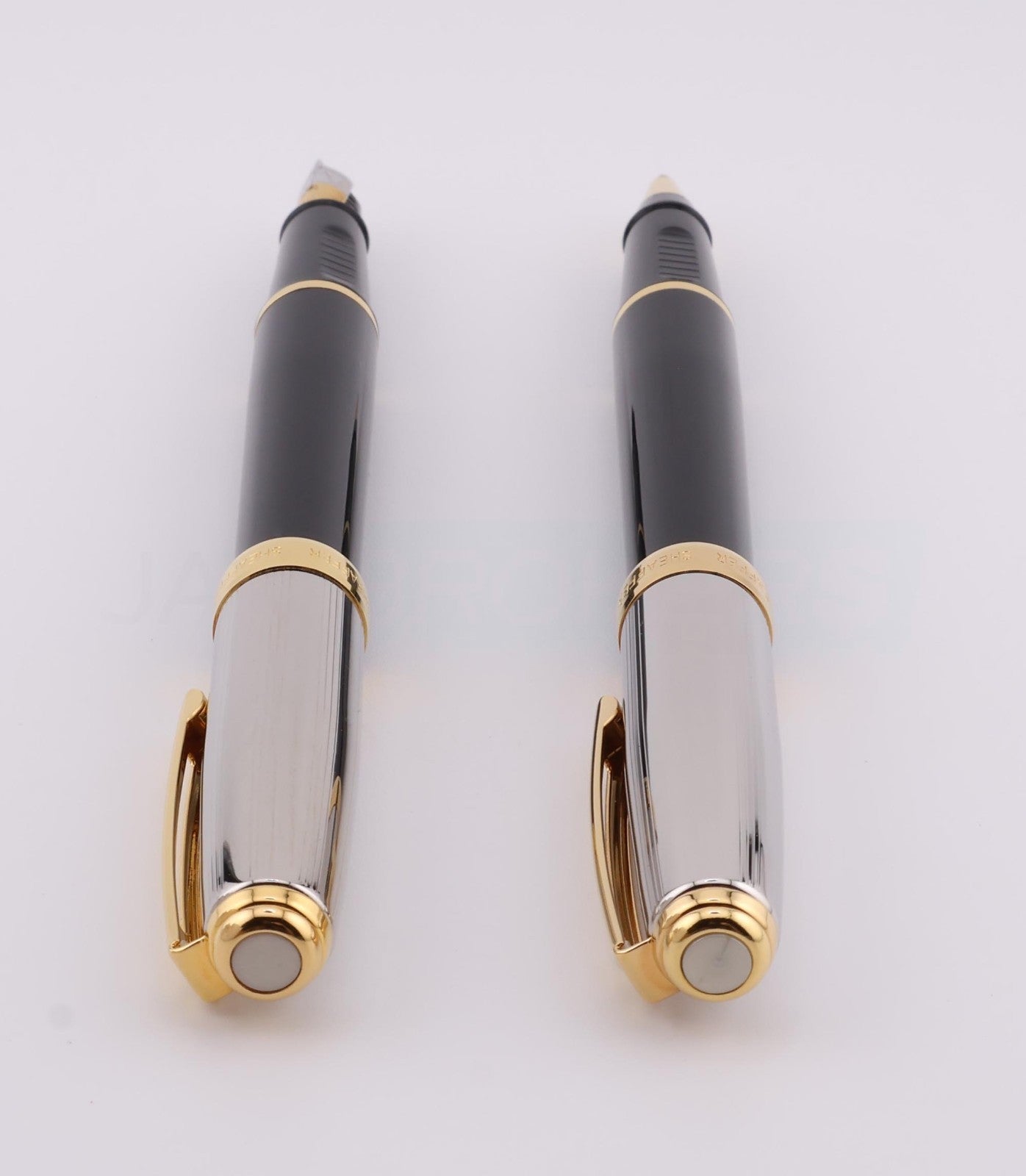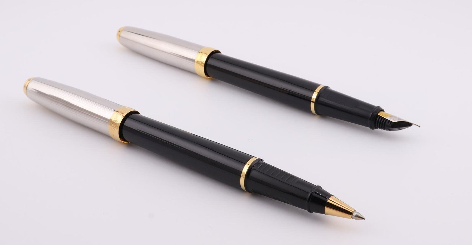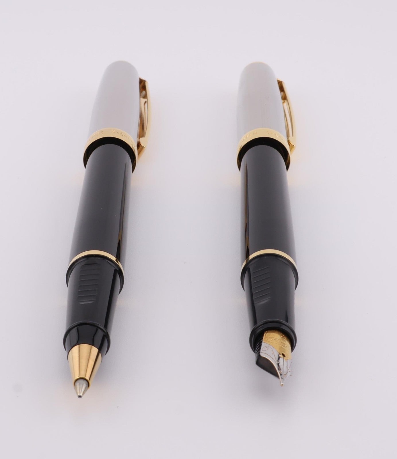 These pens are gently used. The pens shows minor signs of wear and tear including scuff marks and worn finishes. The nib of the fountain pen has some discoloration on the gold finish and some tarnishing in the engraved area of the silver finish. Please refer to the pictures to get a better idea of the physical condition. The rollerball pen cartridge is dry and needs replacement. We tested the fountain pen by drawing in test water and expelling it. Any adjustments, inking, cleaning, and/or maintenance are the expense and responsibility of the new owner. All pictures included in this listing are of the actual item for sale.