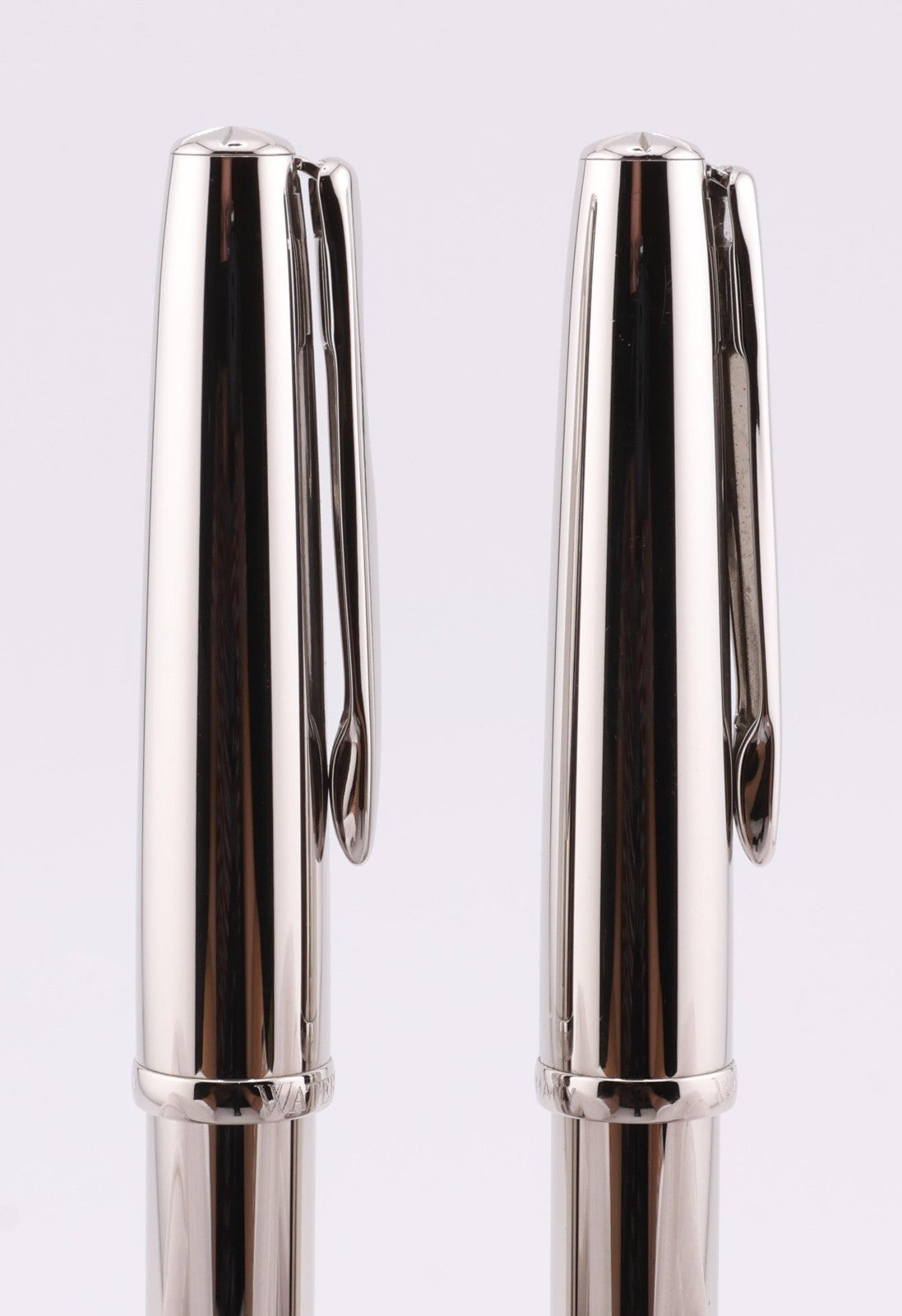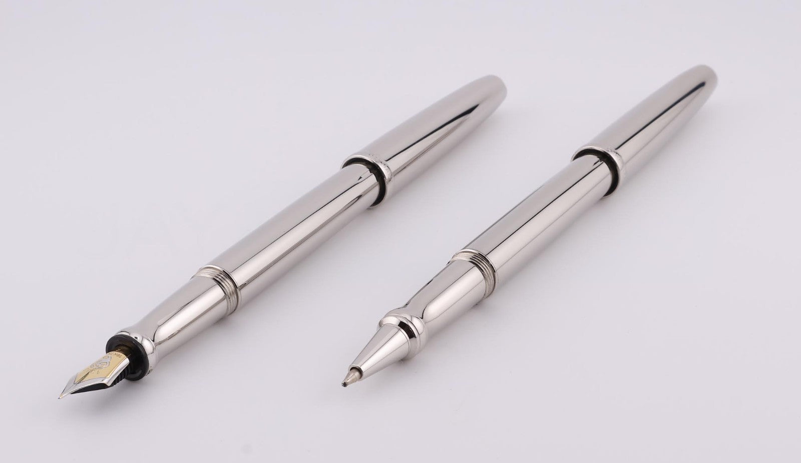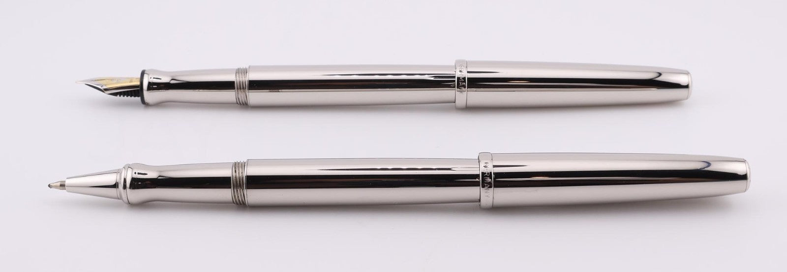 These pens are gently used. They show minor signs of wear and tear including scuff marks and worn finishes. Please refer to the pictures to get a better idea of the physical condition. The rollerball pen cartridge is dry and needs replacement. We tested the fountain pen by drawing in test water and expelling it. Any adjustments, inking, cleaning, and/or maintenance are the expense and responsibility of the new owner. All pictures included in this listing are of the actual item for sale.
