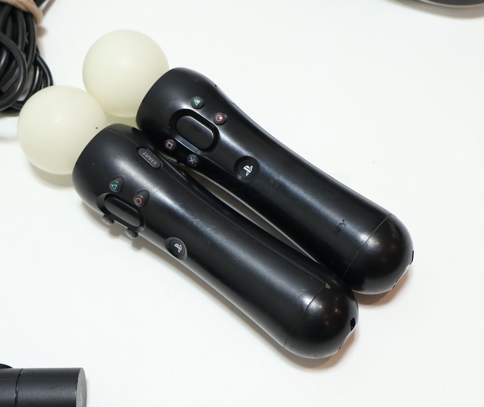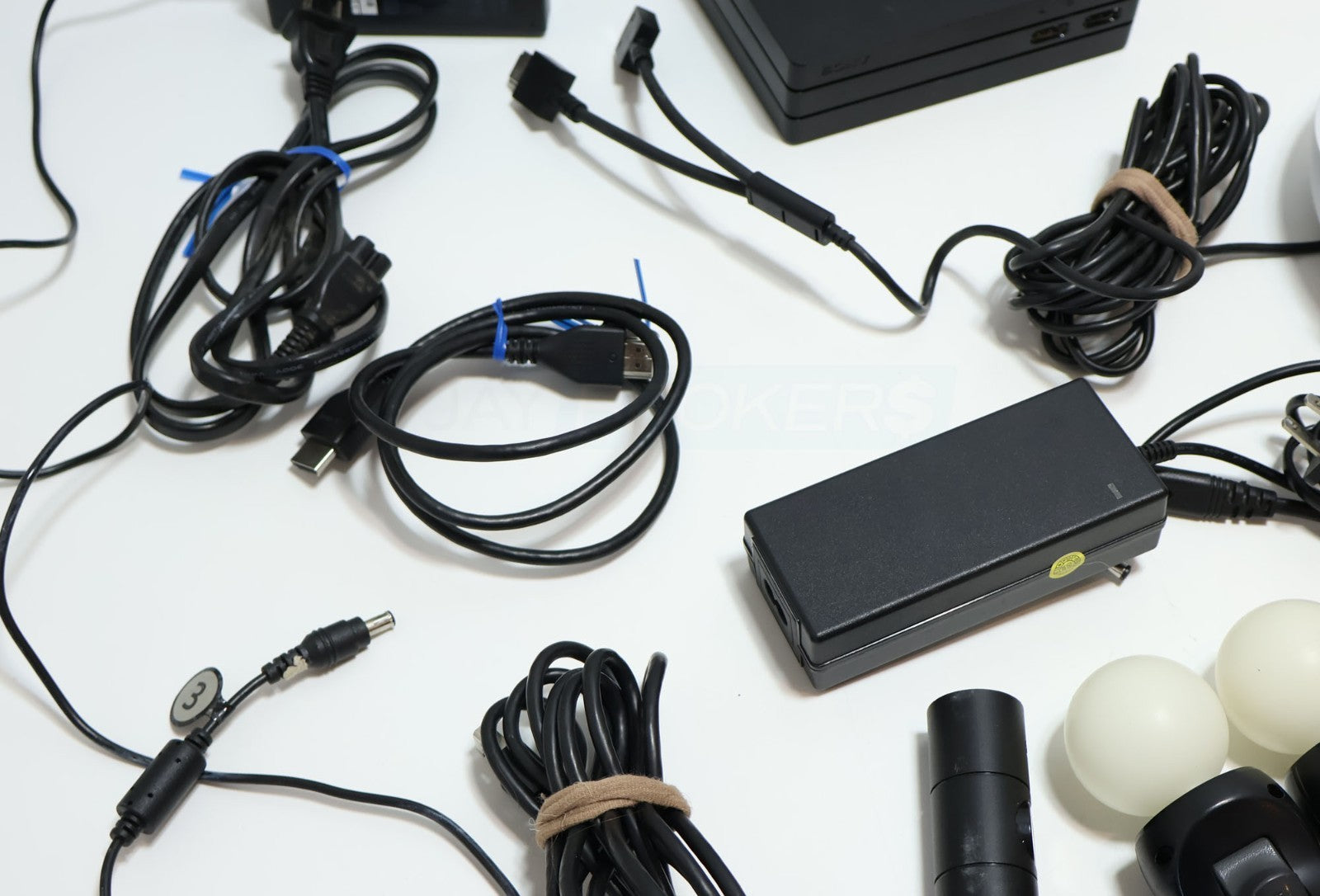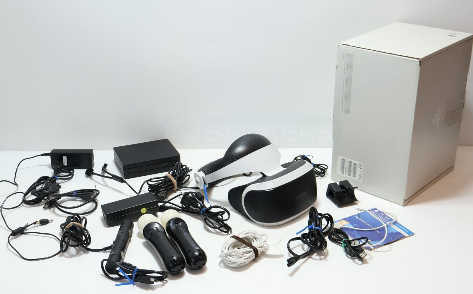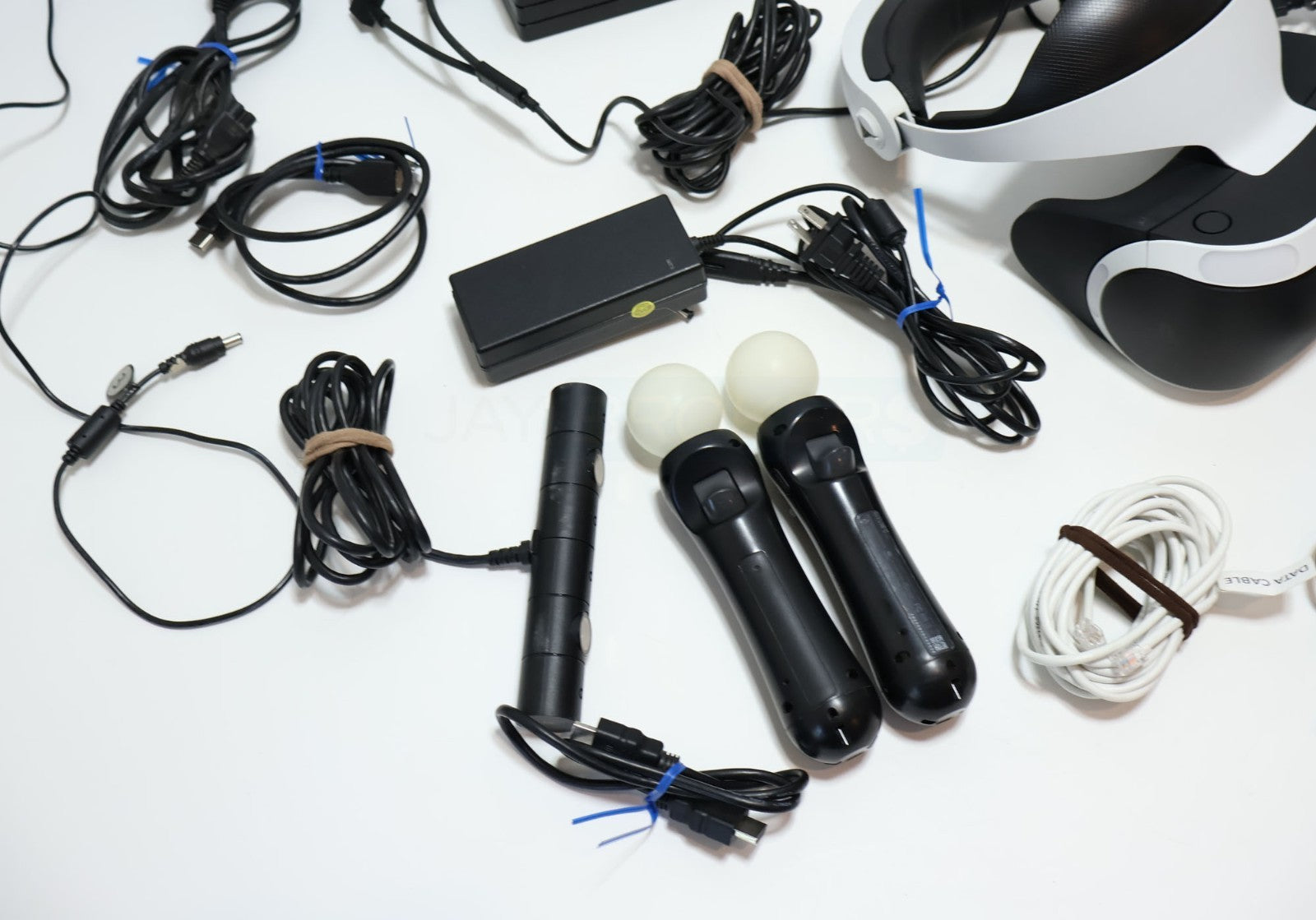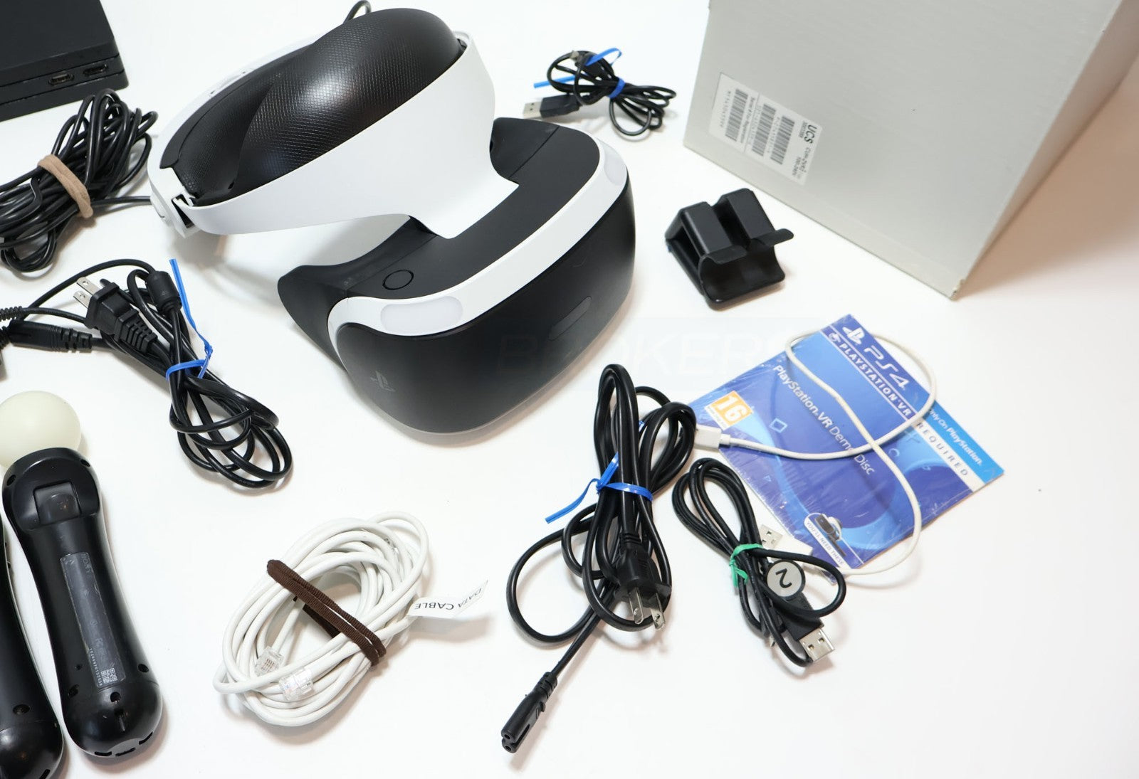 Includes: VR Headset, Processing Unit, Camera, AC Adapter/Power Cable, Aftermarket AC Adapter/Power Cable, 2x HDMI Cable, 3x Micro-USB Cables, Data Cable, Camera Stand, 2x Controllers, Manual, Demo Disc, Box